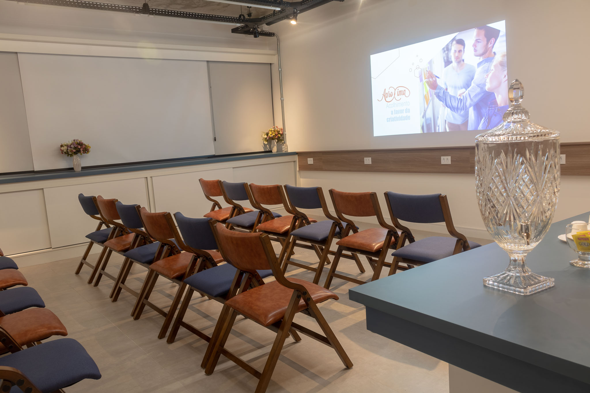 Layouts reconfiguráveis para reunião, aula, workshop ou palestra. Turnos de meio dia ou dia inteiro — você escolhe o que faz sentido para o seu evento.